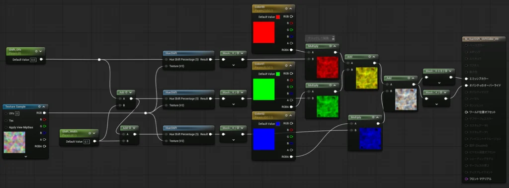 前回と同じくRGBに3種のノイズマップを入れたテクスチャから、3つの[HueShift]を繋ぎます。