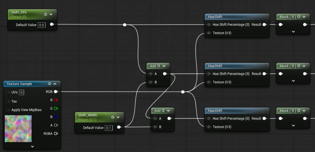 ■前半:ズレ幅パラメータ[Shift Width]を挟みつつ、3つの[HueShift]への接続