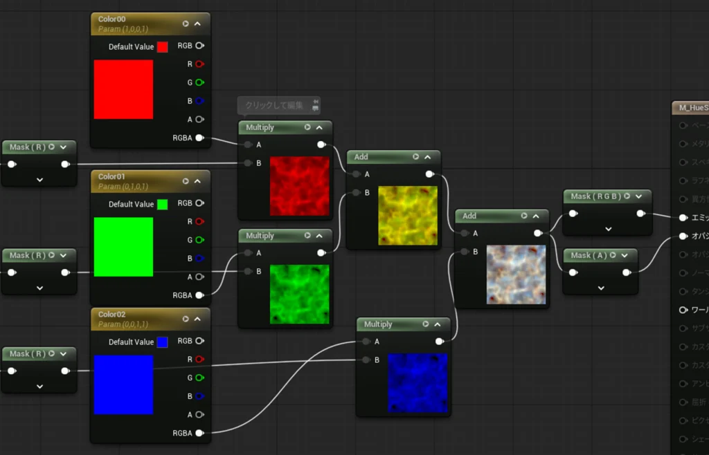そして次に、3つの[HueShift]の結果に、それぞれカラースケールパラメータを乗算し、色を付けられるようにします。