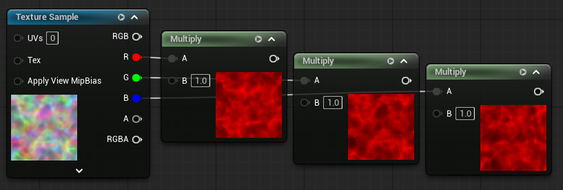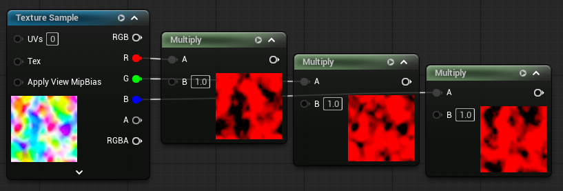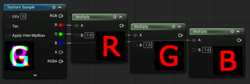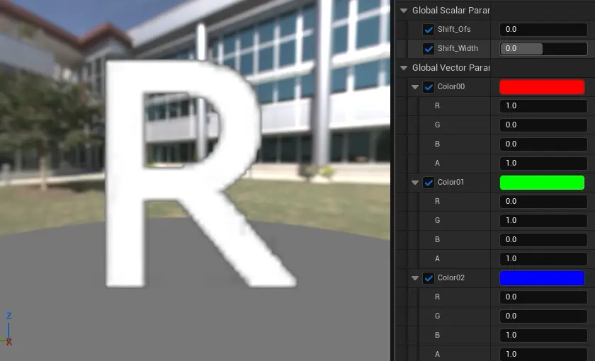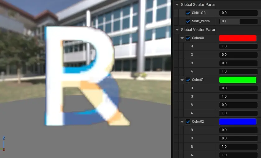 [TextureSample]1つと[HueShift]3つを使用し、パラメーター操作でRGBの色差ズレを調整できるようにするテストです。