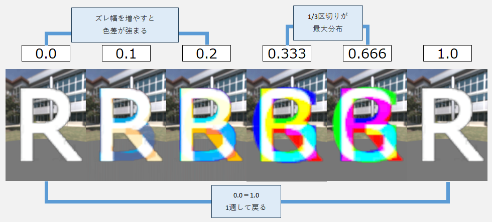 [Shift Width]を加算する事で、3つの[HueShift]による変化にズレが生じ、そのズレが色差となります。